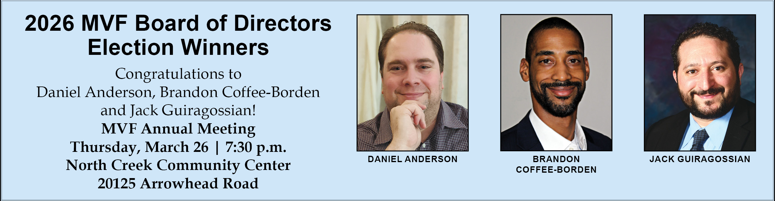 Coffee-Borden, Guiragossian and Anderson reelected to 2026 MVF Board of DirectorsThree candidates for the Montgomery Village Foundation (MVF) Board of Directors were reelected to fill the three ending term seats on the Board. After about eight weeks ...